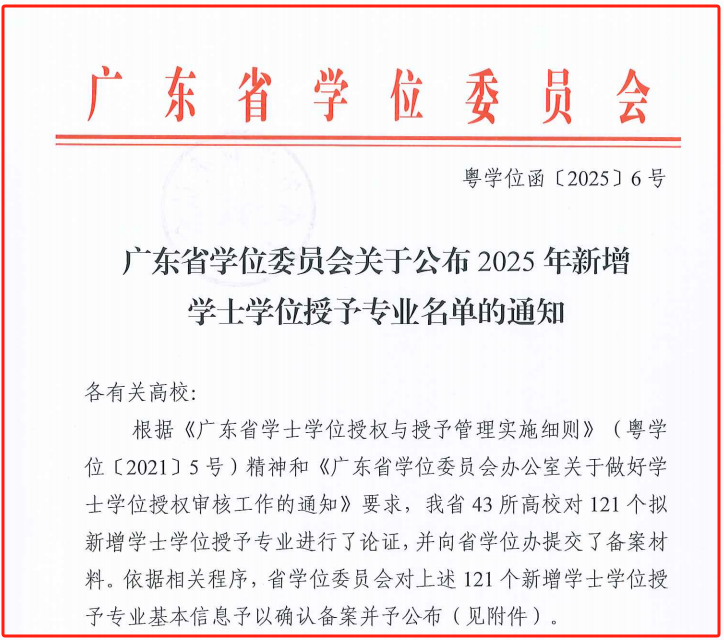 近日,广东省学位委员会发布《广东省学位委员会关于公布2025年度新增学士学位授权专业名单的通知》(粤学位函〔2025〕6号),我校护理学、珠宝首饰设计与工艺、数字经济、金融数学4个专业顺利通过学士学位授权专业审核,获得学士学位授予权。