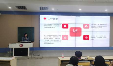 教评中心郑惠丹老师从学生教学信息员的工作职责、奖惩制度、工作重要性和工作要求四个方面进行了讲述,介绍了设置学生信息员为班委的意义和必要性,并指出信息员是学校教学监控体系中不可或缺的重要组成部分,需要搜集、甄别、整合与反馈有效教学信息,及时反映教学一线的最新动态。随后,郑老师对信息员提出了思想上要高度重视、工作上要细致入微、善于提炼信息、提升服务意识等要求。同时,老师强调了教学信息员工作是学校教学质量监控体系的一个重要环节,信息员们及时了解各任课教师的教学状况,收集教与学相关信息,为学校教学质量的提高贡献自己的力量。